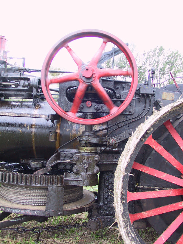 Blechverkleidung. Weitere Räder übertragen die Kraft an das fast zwei Meter
