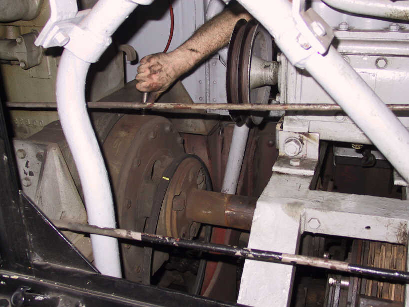 Da man weder Getriebe noch Motor verrücken kann, muß die Hardyscheibe, eine elastische Verbindung zwischen Welle und Getriebe, ausgebaut werden. Dann können durch den dadurch freigewordenen Zwischenraum die neuen Keilriemen gefädelt werden. Die Bolzen die die Hardyscheibe halten sind natürlich sehr fest, denn sie sollen im Betrieb nicht wegfliegen. Wir Hobbyeisenbahner haben die gutgemeinte Schätzung der Arbeitszeit eines Werkstattmeisters natürlich leicht überschritten. |