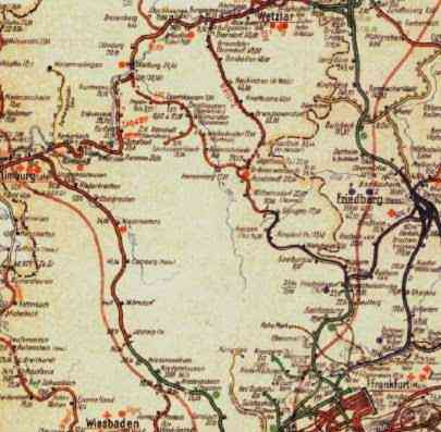 Die Kerkerbachbahn ist hier schon bis Hintermeilingen zurückgebaut. Dafür ist westlich der Strecke Frankfurt - Limburg die Reichsautobahnplanung in braun eingezeichnet!