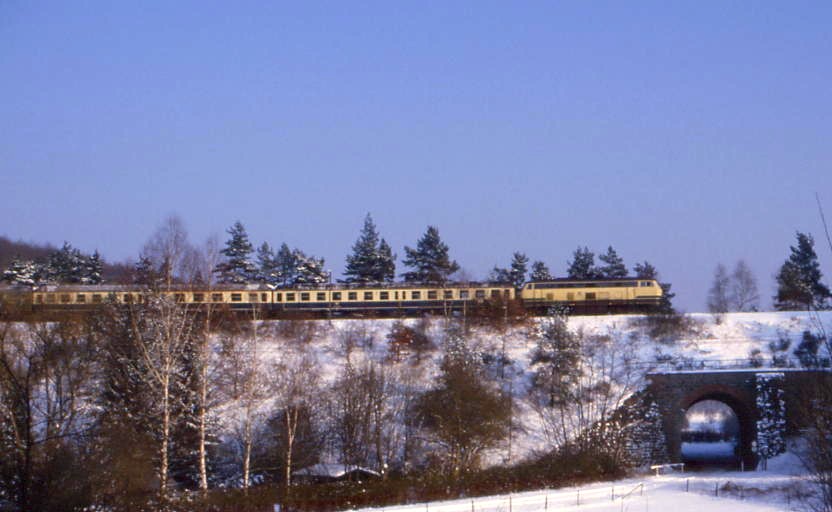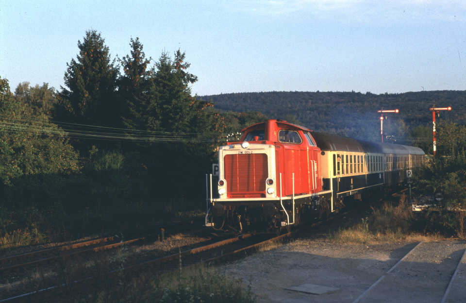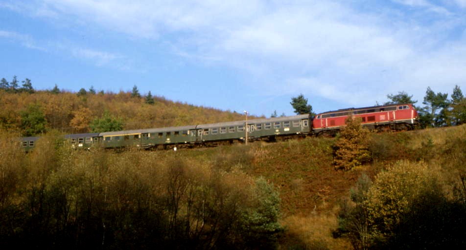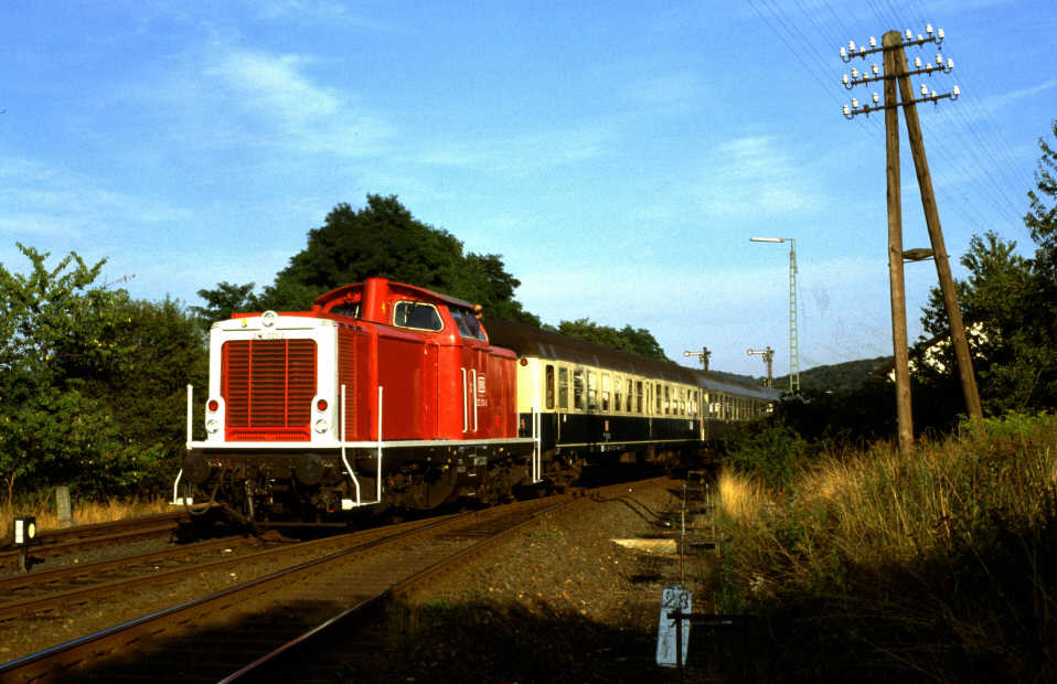 Erst etwa 1990 gab es wieder etwas Abwechslung. Da ein Großteil der AB-Silberlinge modernisiert wurde und dadurch ein Mangel an diesen Wagen bestand, führte der "Eilzug" aus Frankfurt einen 1.Klasse Schnellzugwagen der Bauart Am 203 mit Scheibenbremse und dritter Klappstufe, die man bei den niedrigen Bahnsteigen auch gut brauchen konnte. Fast 20 Jahre nach dem berühmten "Franzosenzug" war es wieder möglich, sich mit Fernstrecken-Komfort durch den Hintertaunus schaukeln zu lassen. Leider passte die 212, die die 216 zeitweise ersetzte, nicht ganz zu diesem "hochwertigen" Wagen. Die Zugnummern hatte die DB inzwischen auf N3563/N3580 geändert. |