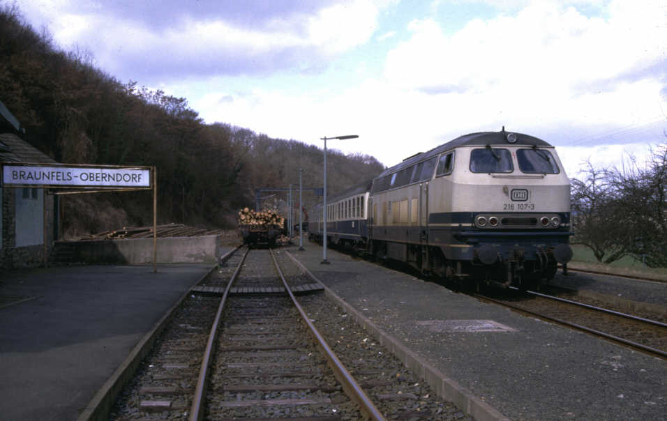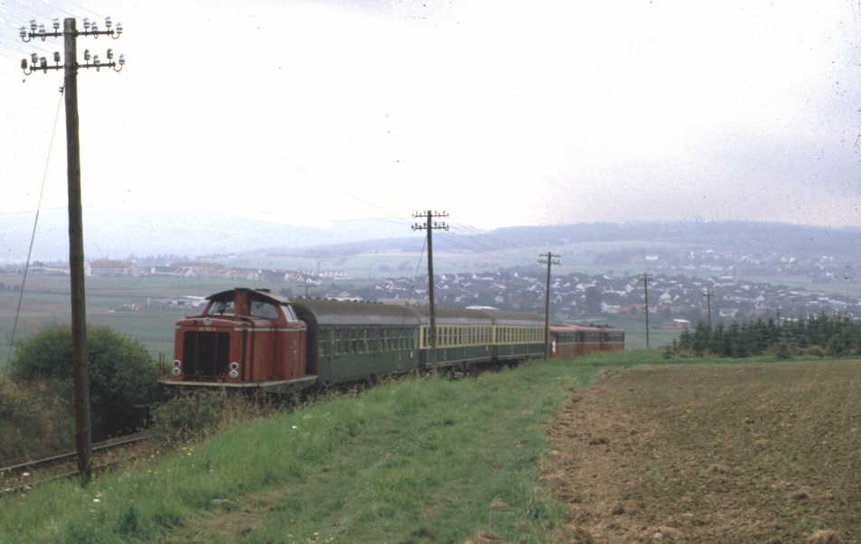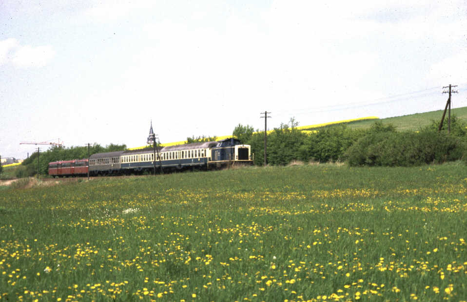 Noch vor der Stillegung des Abschnitts Albshausen-Grävenwiesbach wurde das Wagenmaterial erneut umgestellt. Die Umbauwagen wurden durch Mitteleinstiegswagen (AByl, Byl, BDyl) ersetzt, die nun wiederum durch andere Wagentypen ergänzt wurden, oftmals nun die allgegenwärtigen Silberlinge (ABn, Bn). Ursprünglich als Vier-Wagen-Zug im Reihungsplan stehend wurde der N8761 jedoch schon bald auf drei Wagen reduziert. Da die Mitteleinstiegswagen zum großen Teil türkis/beige lackiert waren, gab es kurz vor dem Ende der Solmstalbahn im Reisezugverkehr noch die Möglichkeit, einen zusammen mit der 216 einheitlich lackierten Zug zu erleben. Allerdings war der N8761 auch der einzige lokbespannte Reisezug auf dem Abschnitt. Ansonsten dominierten weiterhin die Schienenbusse, nach der Abstellung der letzten einmotorigen 795 zum 01.06.1980 allerdings ausschließlich die zweimotorigen 798. |