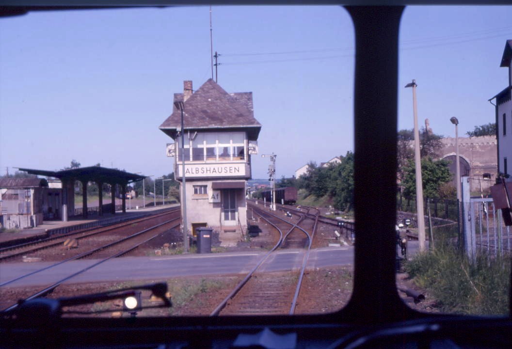 Der recht große Bahnhof mit einem Mittelperron und einem Seitenbahnsteig auf der Streckenseite nach Weilburg, war nie Endbahnhof der Züge aus Grävenwiesbach. Die große Industrievergangenheit von Albshausen ist noch heute erkennbar. Bis Anfang der achtziger Jahre führte eine Seilbahn zur letzten Temper-Erzgrube „Fortuna“ quer über das Lahntal zum Bahnhof Albshausen. |
