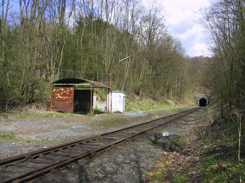 Unmittelbar hinter der Haltestelle verschwindet der Zug in den 1300 Meter langen schnurgeraden Hasselborner Tunnel, der unter dem Berg Gänserod durchführt. |