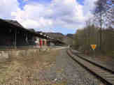 Vom Bahnhof Grävenwiesbach aus führte die Strecke nach Wetzlar einst zwischen Weichenwärterstellwerk rechts und Lokschuppen links zunächst noch leicht ansteigend durch Einschnitte und über teils hohe Dämme zur Haltestelle Jägerhaus, die zunächst nur eine Holzverladestelle war. |