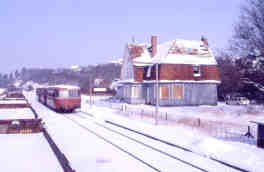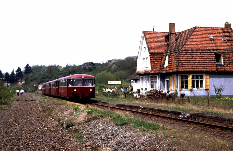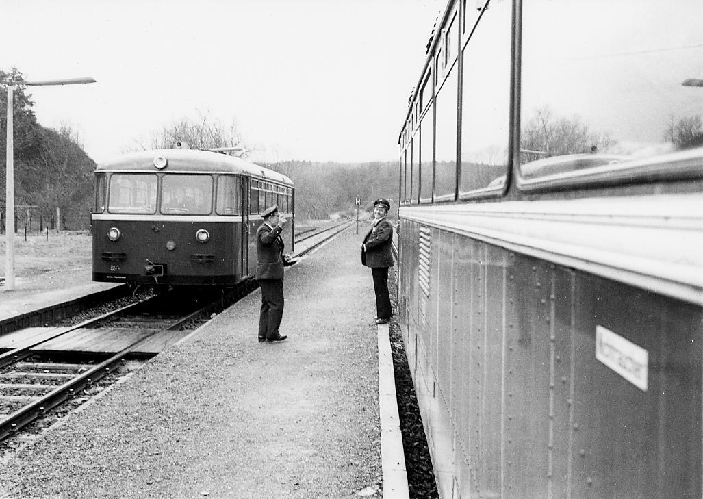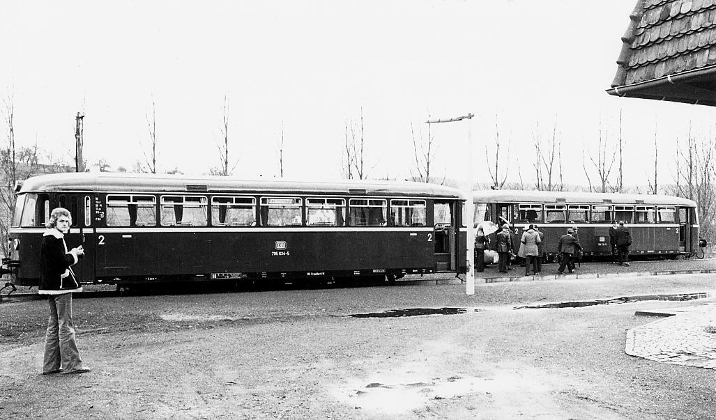 Die beiden s/w-Bilder vom 8.02.1977 belegen eine einzigartige Situation: Eine kurze Zeit lang fuhren täglich zwei Zugpaare von Wetzlar und Bad Homburg jeweils bis Kraftsolms und machten dort Kopf! Ein VT 95 und ein VT 98 trafen sich also zum Tratschen und die Passagiere hatten das Nachsehen bzw. Umsteigen. |