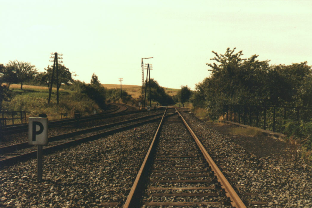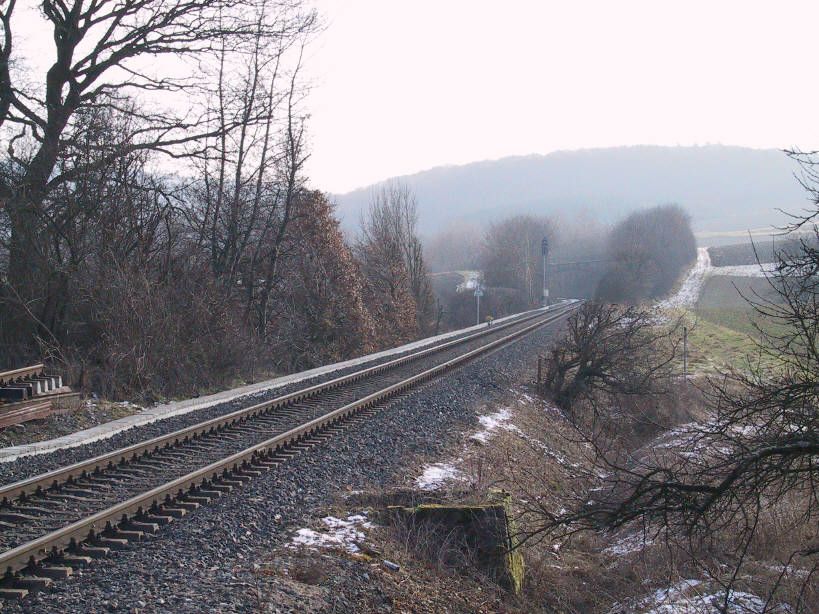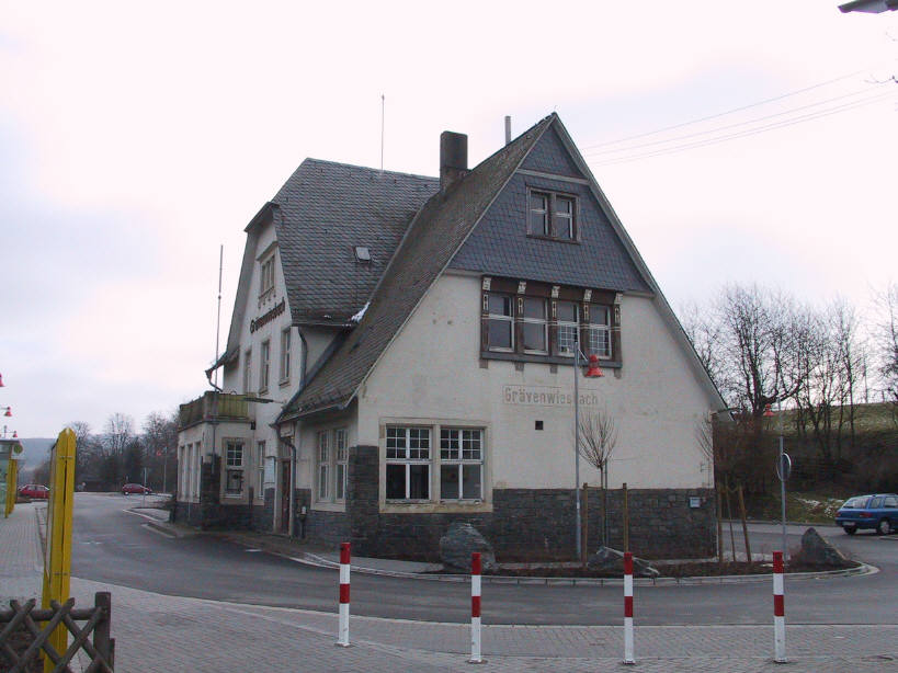 Der 1909 entstandene Bahnhof von Grävenwiesbach war zunächst Kopfbahnhof, denn der neu eröffnete Abschnitt Usingen - Weilmünster erforderte hier der Topographie wegen eine entsprechende Anlage. Geplant war aber schon der 1912 erfolgte Weiterbau in das Solmsbachtal, das allerdings nur durch einen 1300 Meter langen Tunnel erreichbar war. Der ländliche Bahnknotenpunkt wies eine großzügige Gleisanlage auf. Einfahrend linker Hand lag zunächst das noch bis 1993 betriebene „Ausziehgleis“, sodann weiter links etwas tiefer liegend das Streckengleis der Eisenbahnstrecke nach Weilmünster und Weilburg. |