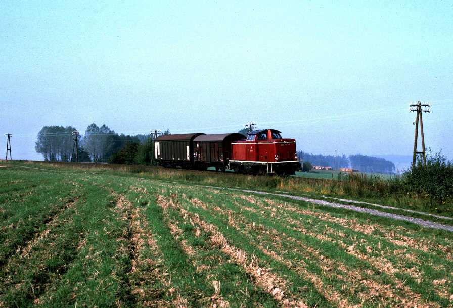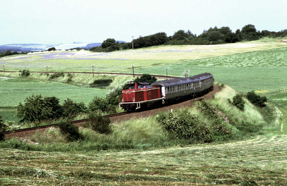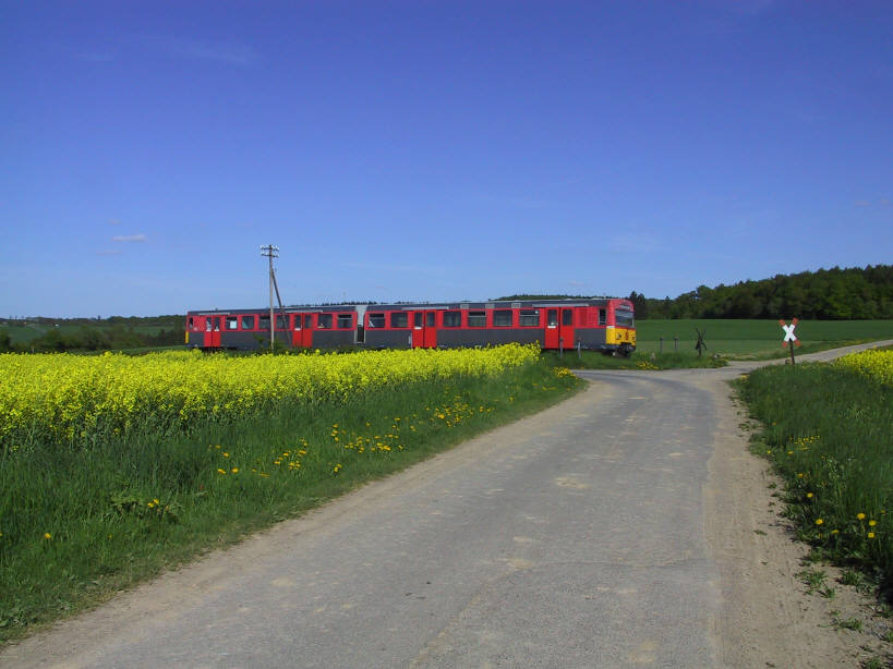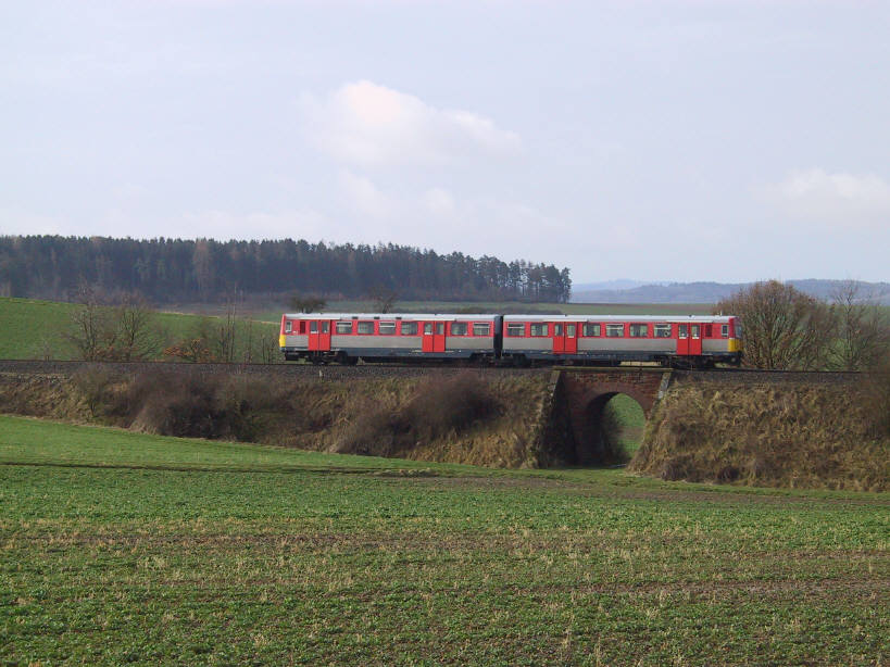 Von links kommt der Zug aus Grävenwiesbach, fährt vorbei am Dorf Naunstadt und kommt nach Hundstadt. Dann geht’s weiter in einer großen Rechtskurve in Richtung Wilhelmsdorf. Klick auf das Bild läd eine Quicktimeversion! |
