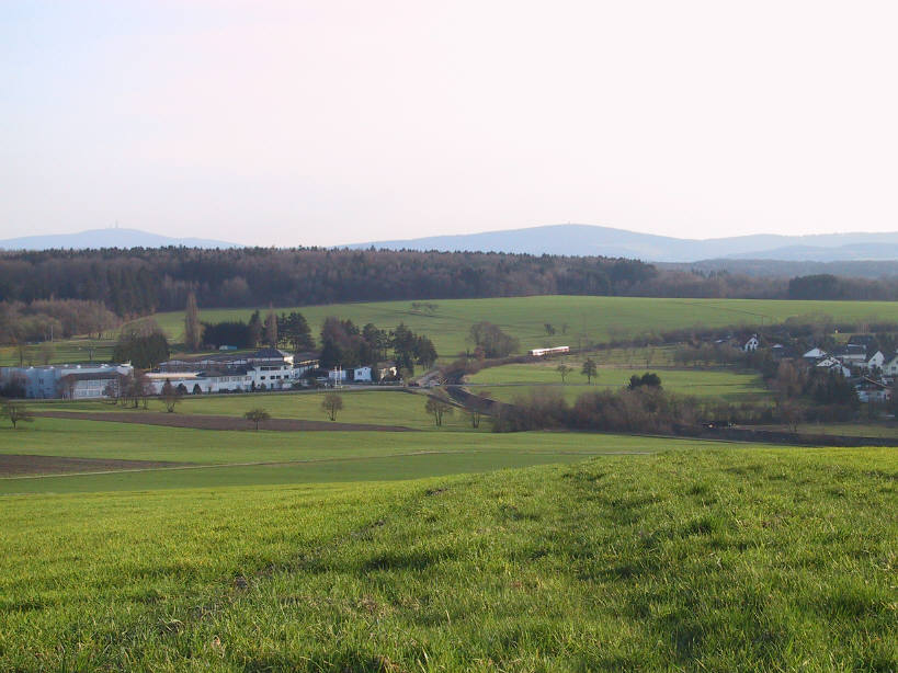 Den Wald verlassend, senkt sich das Gleis in einer imposanten Schleife - der Hundstadter Kurve - mit weitem Ausblick nach Hundstadt, einem Haltepunkt der Taunusbahn, dessen Bahnhofsgebäude ebenfalls verkauft wurde. Nach einer nochmaligen Kehre um den Hardtkopf ist der Bahnhof Grävenwiesbach erreicht, von 1985 bis 1999 Endpunkt der Taunusbahn. |
