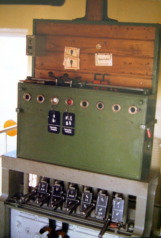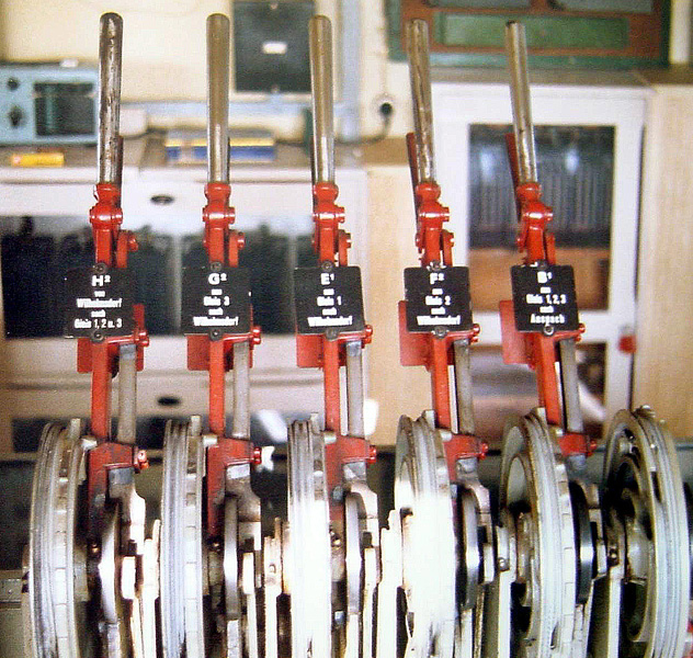 Zwei Bilder aus dem alten Stellwerk in Usingen: Links Fahrstraßenschalter und rechts die Hebelbank. |