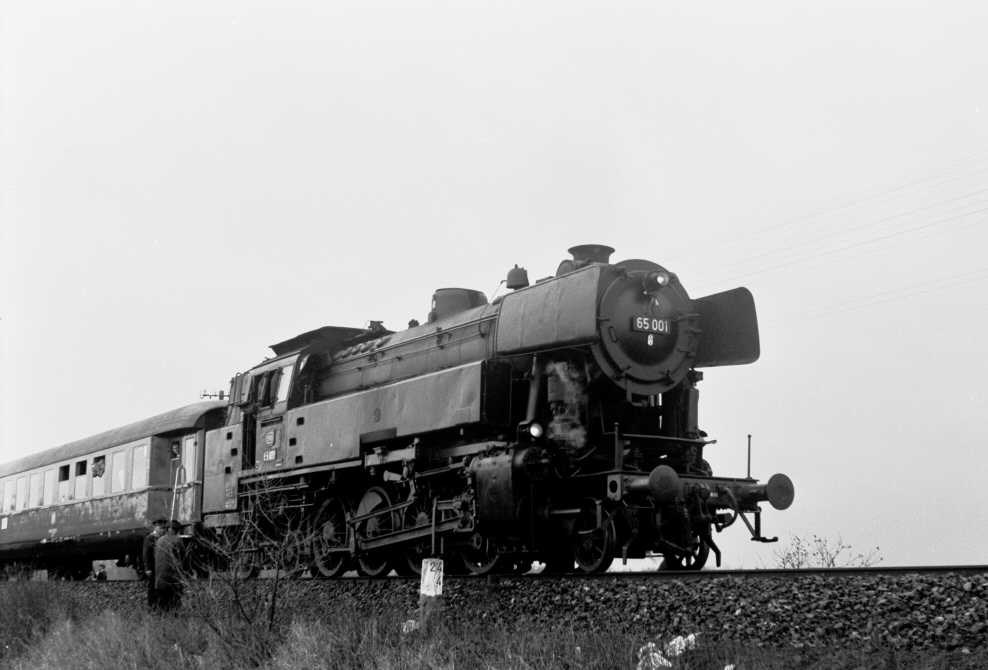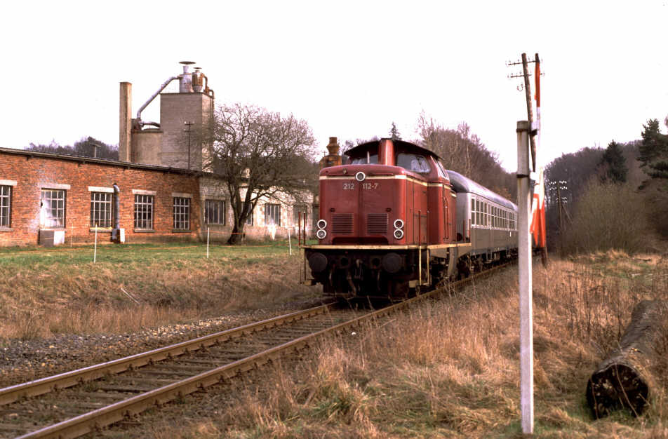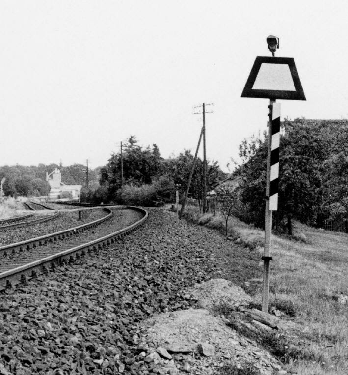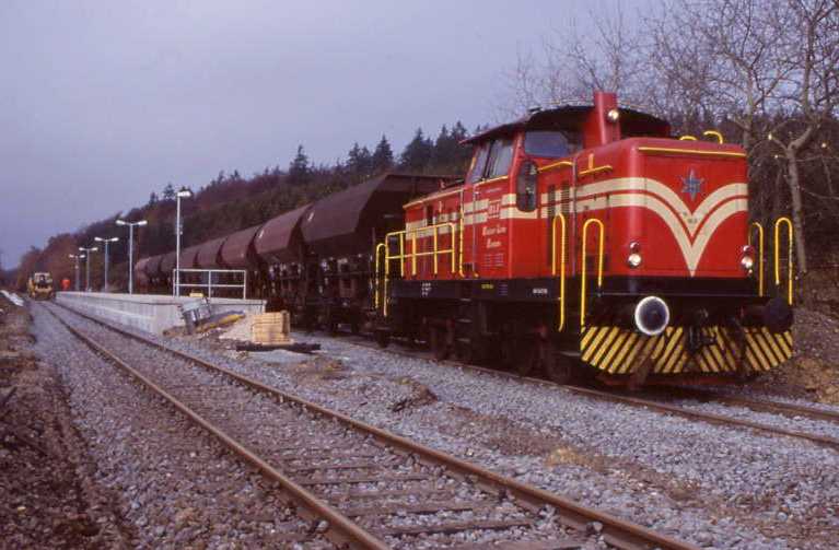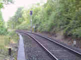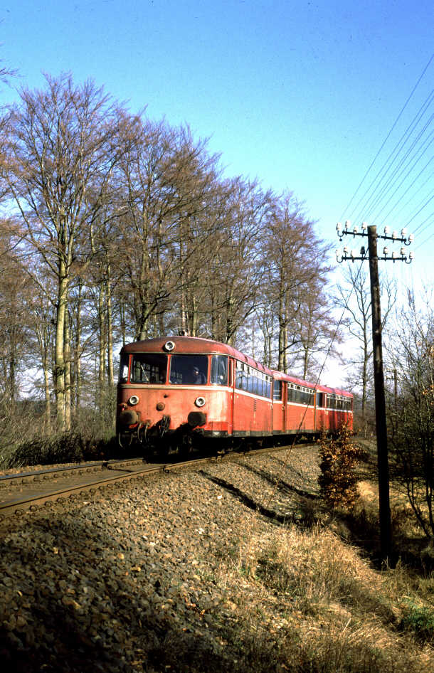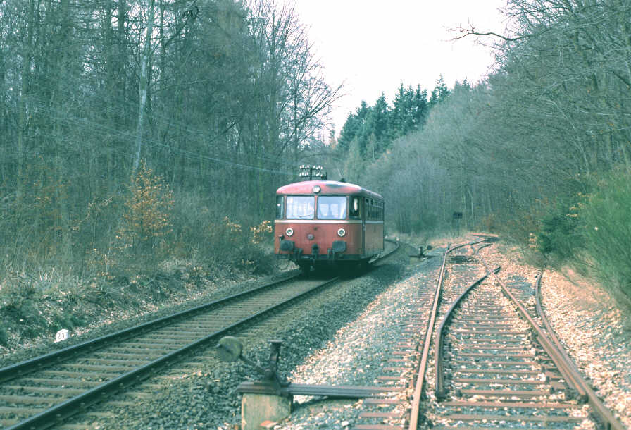 Unmittelbar hinter dem Bahnhof Usingen - links war übrigens ein Gleisanschluss für Raiffeisen und rechts für ein Sägewerk - steigt die Bahnlinie mit 1:50 an. Die Wasserscheide zwischen Usa- und Weiltal wird durch eine über fünf Kilometer lange Rampe erklommen. Bis zu dem fast auf dem Scheitelpunkt liegenden Bahnhof Wilhelmsdorf (Taunus) werden 100 Meter Höhenunterschied überwunden. |