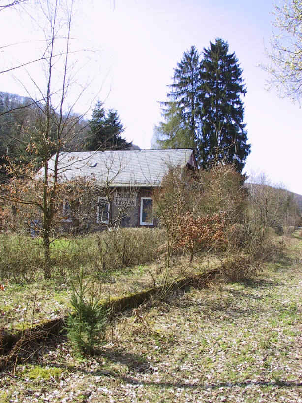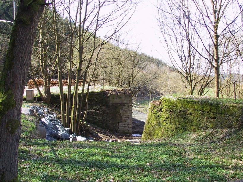 Am Fuße der Burg schmiegte sich die Bahn - links der Weil - an die Wälder des Tales und erreichte mit Essershausen den ersten richtigen Bahnhof. Essershausen - heute Ortsteil von Weilmünster - diente bis zuletzt im Personenverkehr als Ausweichstelle. Der kleine Bahnhof hatte selbst weniger Bedeutung als die unweit weilaufwärts gelegenen Verladeanlagen, wo Erz und Steine umgeschlagen wurden. Reste davon sind noch heute zu sehen, auch wenn sich die Natur einen guten Teil zurückgeholt hat. |